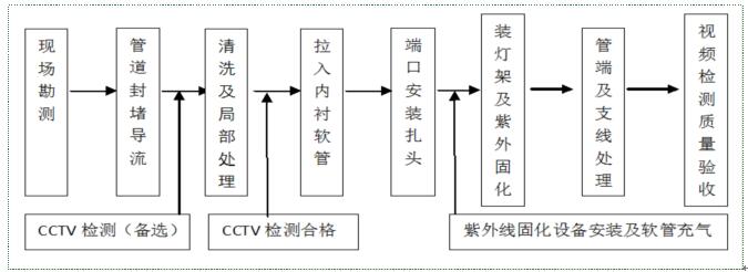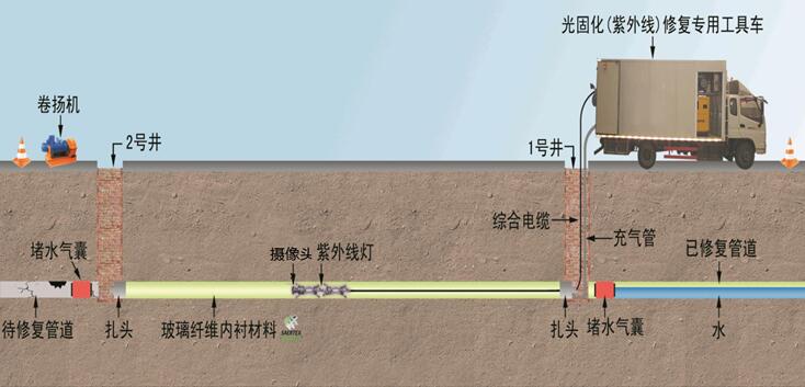 紫外線光固化修復UV-CIPP技術是非開挖修復原位固化法中的一種,住房和城鄉建設部頒布的行業標準《城鎮排水管道非開挖修復更新工程技術規程》(CJJ/T210-2014)中將原位固化法定義為采用牽拉方式將浸漬樹脂的內襯管置入原有管道內,固化后形成管道內襯的修復方法。紫外線光固化技術是將玻璃纖維編制成軟管浸漬樹脂,然后將其拉入原有管道內充氣擴張緊貼原有管道,在紫外光的作用下使樹脂固化形成具有一定強度的內襯管的原位固化法。